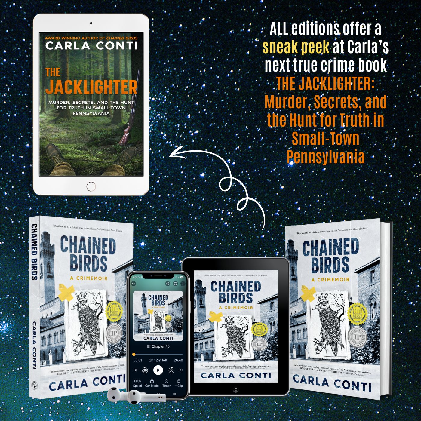 Carla Conti is a former journalist and the award-winning author of Chained Birds: A Crimemoir. Her true crime debut won multiple 2025 national book awards, including 1st Place in True Crime from the Next Generation Indie Book Awards, Winner in True Crime from the Indie Reader Discovery Awards, Silver in True Crime from the Independent Publisher Book Awards (IPPY), Finalist in True Crime from the National Indie Excellence Awards, and a 1st Place Nellie Bly Journalism award from the Chanticleer International Book Awards. Carla is at work on her next true crime book, The Jacklighter, scheduled for release in 2026. She lives in Pennsylvania with her husband, who supports her true crime habit.