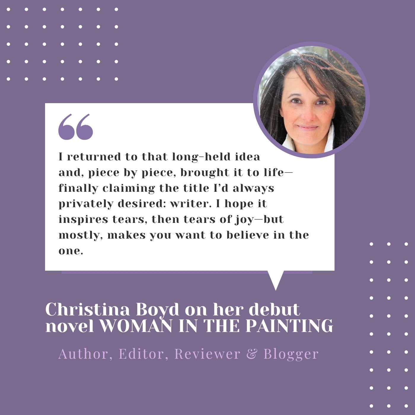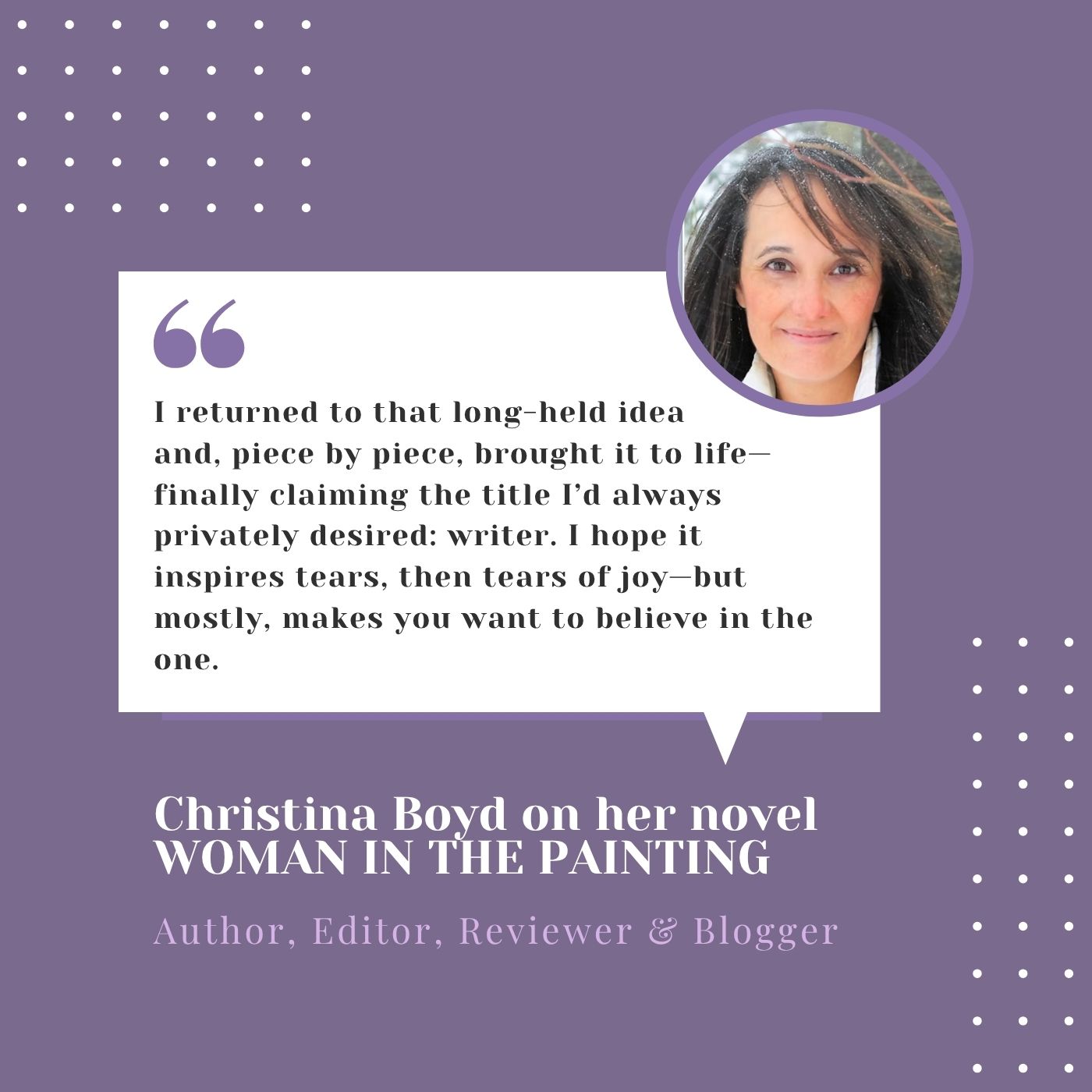 I’d like to thank Christina for featuring me on her blog and adding me to her long, impressive list of author interviews. Christina wears many hats, including writer, blogger, reviewer, artist, and book editor. As noted in her bio section: