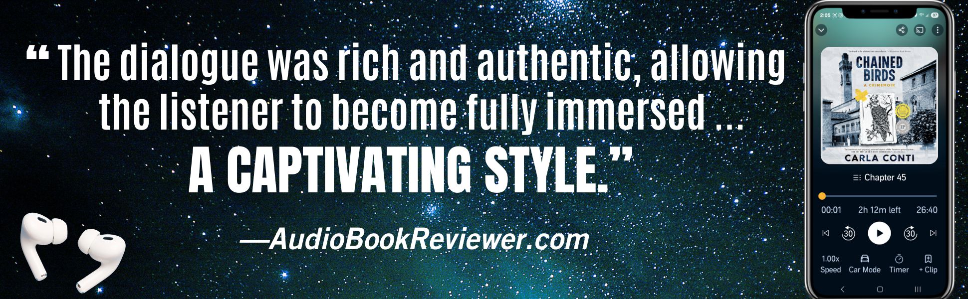 Better late than never! Seven months after receiving this one and only editorial review for my author-narrated audiobook of Chained Birds, I am finally posting it in its entirety. I’m extremely pleased to immortalize this review by AudioBookReviewer.com, even though the reviewer wasn’t so fond of the book’s political aspect. That is the reason, I suspect, for the four-star rating.